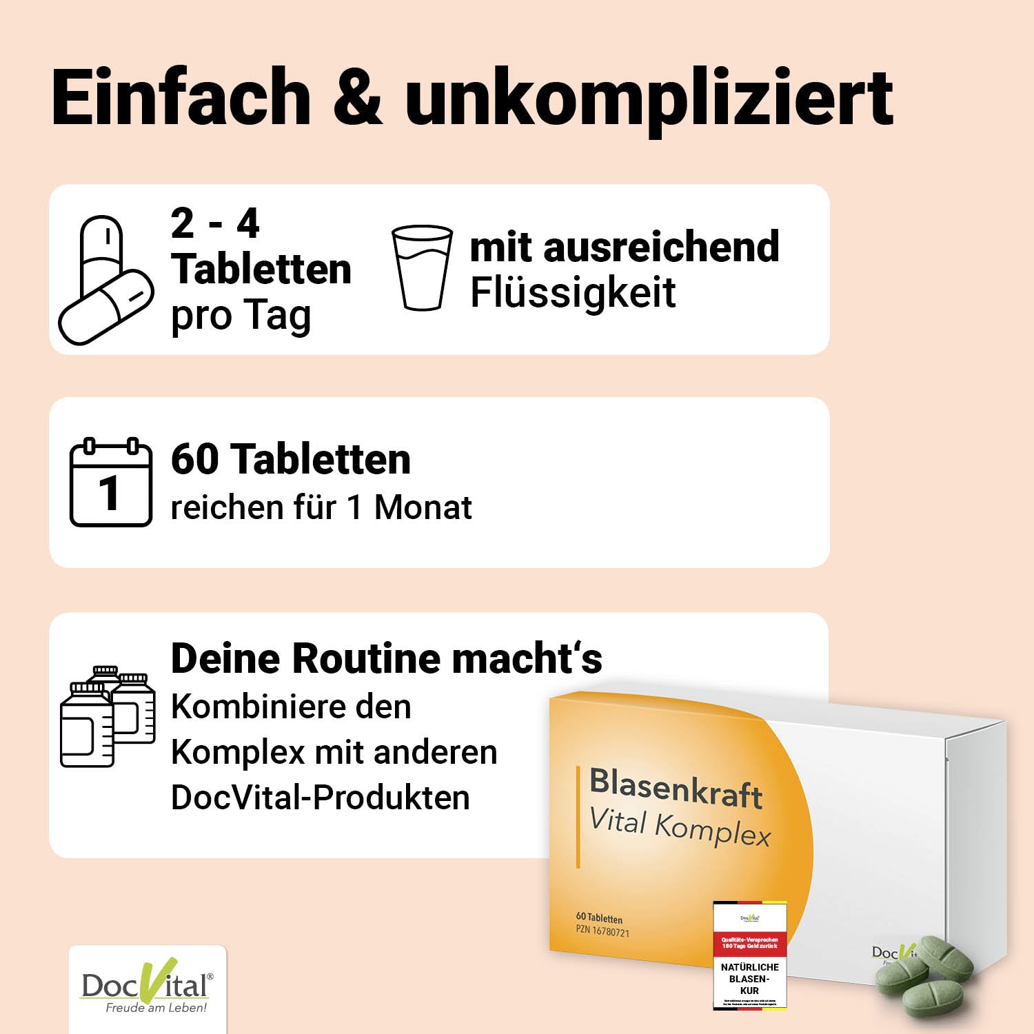 • EINFACHE EINNAHME – 2–4 Tabletten täglich, ideal als Alternative zu Blasentee. Mittel gegen Reizblase oder Inkontinenz. Die dauerhafte Anwendung ist problemlos möglich.