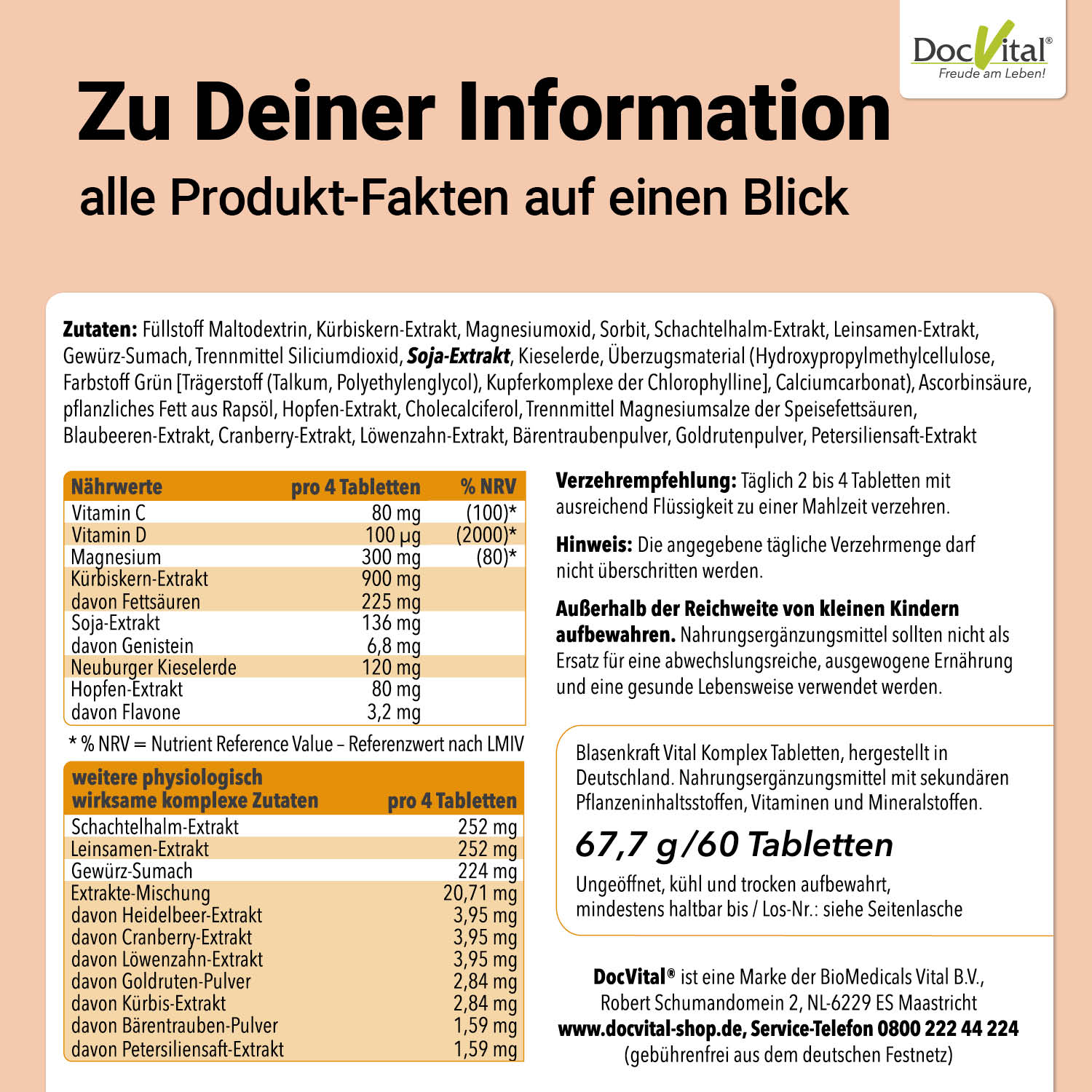 Blasenkraft Vital Komplex ist ein Nahrungsergänzungsmittel zur Unterstützung der Blasengesundheit. Es enthält eine Kombination aus natürlichen Extrakten wie Kürbiskern-, Schachtelhalm- und Leinsamen-Extrakt sowie Vitamine und Mineralstoffe.