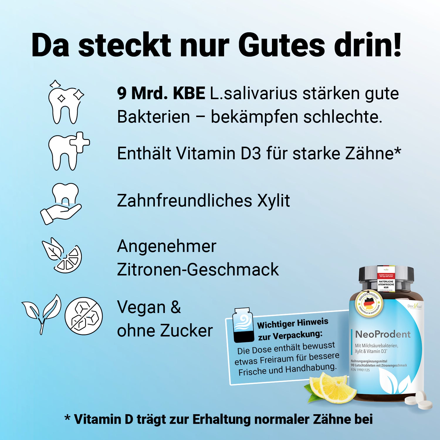 Ein Veganes Nahrungsergänzungsmittel mit Lactobacillus salivarius, Xylit und Vitamin D zur Unterstützung der Mundflora und für ein frisches Mundgefühl.